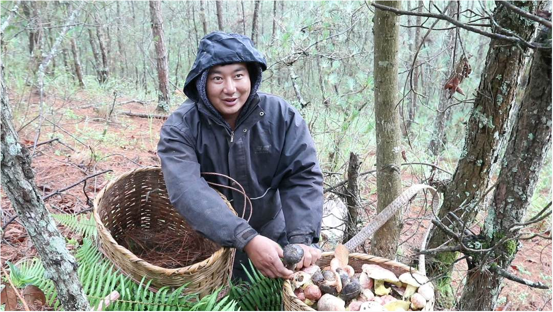 蔣開(kāi)洪從早上6點(diǎn)出發(fā),翻山越嶺,走遍了自己熟知的5個(gè)菌塘。9點(diǎn)左右便采摘到了滿(mǎn)滿(mǎn)一籮筐新鮮的野生菌。他會(huì)把采來(lái)的菌子交售到當(dāng)?shù)匾患倚∮忻麣獾囊吧r(nóng)家樂(lè),賺取一些收入。