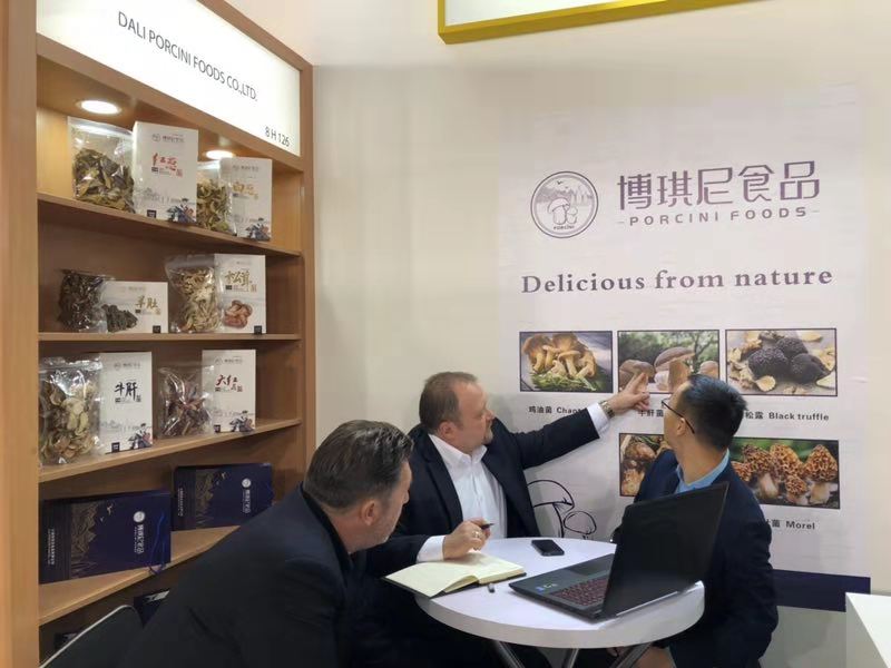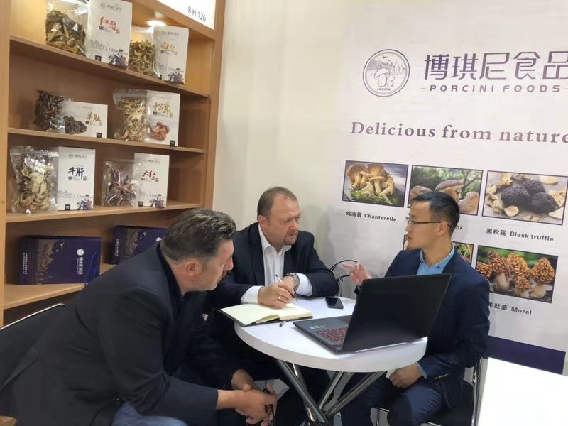 展會(huì)第一天,外國(guó)客商在博琪尼食品有限公司展位前紛紛駐足,詢(xún)問(wèn)產(chǎn)品相關(guān)信息,了解產(chǎn)品質(zhì)量、規(guī)格等,客商們對(duì)博琪尼食品公司優(yōu)質(zhì)的產(chǎn)品質(zhì)量及豐富的出口經(jīng)驗(yàn)給予充分肯定。其中,來(lái)自波蘭的客商Stanistaw Tomkowiak及其合伙人與博琪尼總經(jīng)理龔瑞波進(jìn)行洽談之后,就公司主營(yíng)產(chǎn)品速凍牛肝菌達(dá)成合作意向,初步訂購(gòu)數(shù)量為兩個(gè)柜,并有意簽署長(zhǎng)期合作合同。法國(guó)客商April對(duì)博琪尼出口產(chǎn)品速凍松茸頗為感興趣,表示在法國(guó)越來(lái)越多的餐廳選擇用優(yōu)質(zhì)松茸及牛肝菌作為輔材加入到菜品當(dāng)中,并受到食客的喜愛(ài),法國(guó)對(duì)菌類(lèi)的需求有增無(wú)減,希望與博琪尼達(dá)成合作,將中國(guó)的優(yōu)質(zhì)菌類(lèi)帶給法國(guó)人民。